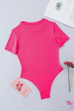 Bodysuit . Rose Rhinestone Allover Round Neck Short Sleeve Bodysuit.